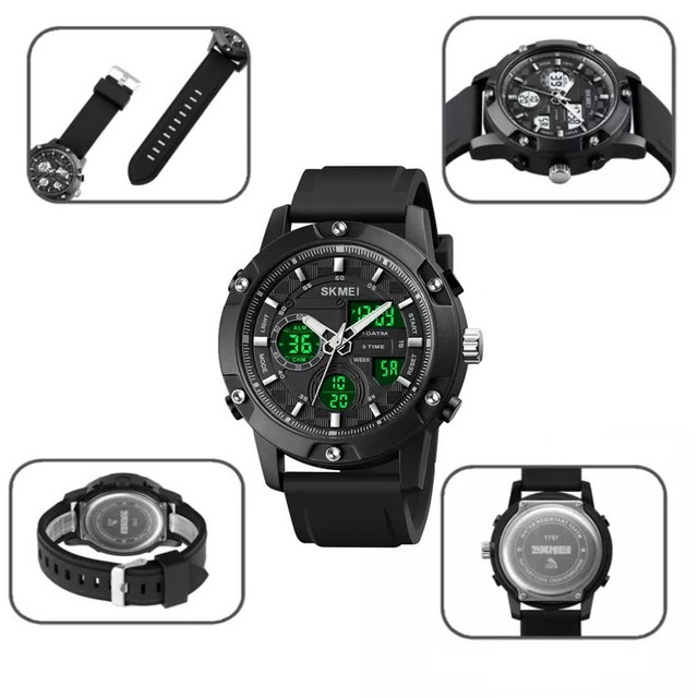 Годинник SKMEI 1757 – не тільки функціональний аксесуар, але й витончений елемент. Цікавий дизайн є відмінністю даної моделі. Класичний чорний колір оригінально виглядатиме не тільки з діловим костюмом, але і одягом стилю casual, а поєднання класичного і цифрового циферблату вигідно виділяє SKMEI 1757 серед різних аналогів.